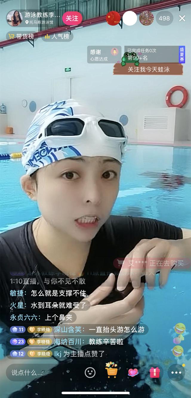圖為@游泳教練李曉穩(wěn) 在抖音直播間講解游泳技巧