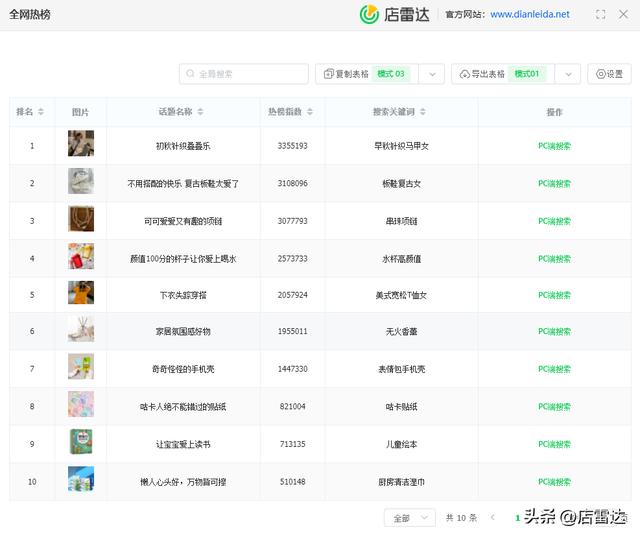 5.全網(wǎng)熱榜:通過獲取搜索上榜話題熱度商品、抖音快手等第三方平臺類目熱采商品,幫助我們了解當(dāng)下消費(fèi)者的喜好與消費(fèi)習(xí)慣;對我們優(yōu)化寶貝選品也有一定的參考作用。